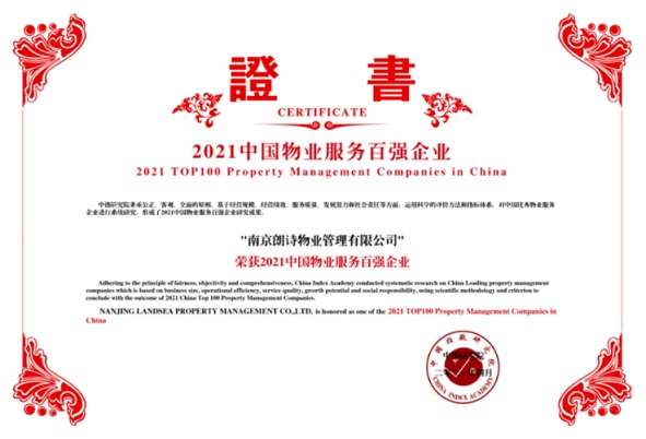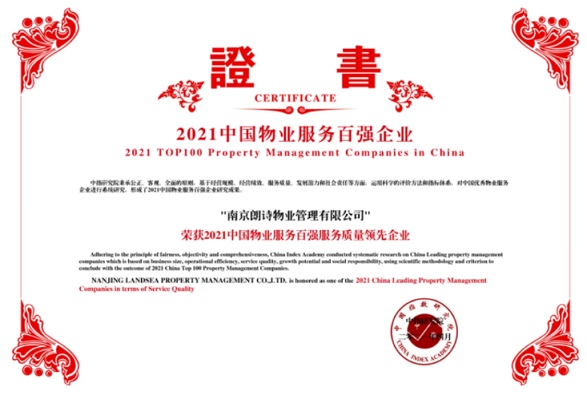朗詩綠色生活憑借行業領先的服務質量、良好的客戶口碑及業務發展、高度的社會責任感,再次贏得業界高度認可,連續5年蟬聯“2021中國物業服務百強企業”,排名提升至TOP24,并榮獲“中國物業服務百強服務質量領先企業”、“中國物業服務百強滿意度領先企業”、“中國物業管理行業市場化運營領先企業”、“中國物業服務年度社會責任感企業”。