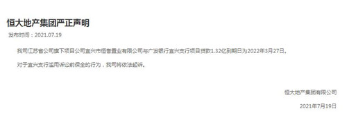 對(duì)此,恒大集團(tuán)發(fā)布聲明,我司江蘇省公司旗下項(xiàng)目公司宜興市恒譽(yù)置業(yè)有限公司與廣發(fā)銀行宜興支行項(xiàng)目貸款1.32億到期日為2022年3月27日。對(duì)于宜興支行濫用訴訟前保全的行為,我司將依法起訴。
