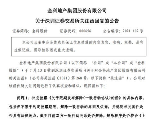 在回復函中,金科股份表示,為進一步明確各股東方意見,公司在收到關注函后,于2021年7月13日再次就是否解除一致行動關系向黃紅云先生、重慶市金科投資控股(集團)有限責任公司、陶虹遐女士及重慶虹淘文化傳媒有限公司發函問詢,“雙方均未就解除《一致行動協議》做出明確意思表示,故未產生解除《一致行動協議》的法律后果”。