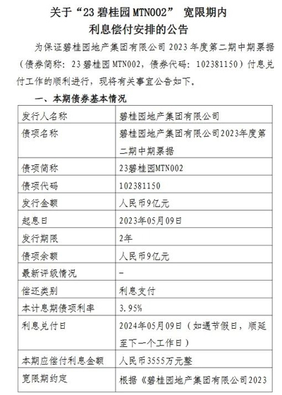 [提要]5月9日,碧桂園發(fā)布公告稱,“23碧桂園MTN002”本期償付資金無法在利息兌付日2024年5月9日按時支付,本期應(yīng)償付利息金額為3555萬元。公司盡力于寬限期3個工作日內(nèi)(不晚于5月13日)足額償付本期中期票據(jù)應(yīng)付利息及寬限期內(nèi)利息。
