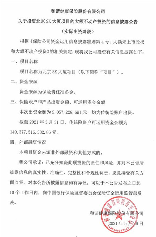 房訊網(wǎng)訊 6月1日,和諧健康保險股份有限公司發(fā)布大額不動產(chǎn)投資公告稱,公司采用股權方式投資方式,出資約90.57億元收購北京新錦城房地產(chǎn)經(jīng)營管理有限公司100%股權,從而持有北京SK大廈。本次投資資金來源為保險責任準備金,均為傳統(tǒng)險賬戶出資。