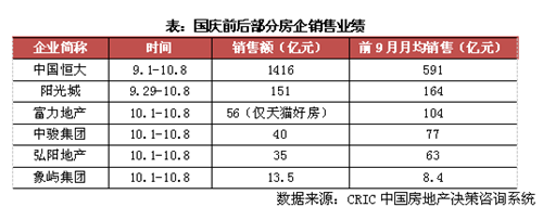 “十一”黃金周過后首日,恒大、富力、陽光城、弘陽等紛紛發布銷售數據。恒大9月1日至10月8日實現銷售額1416億元,根據CRIC推算,其“十一”黃金周期間,恒大的銷售達600億元左右,較去年同期上漲近20%,并且與前9月月均銷售相當。陽光城國慶前后10天銷售額151億,接近前9月月均,富力僅在天貓好房平臺就實現56億元銷售。中駿、弘陽、象嶼“十一”期間分別實現40億、35以及13.5億銷售,均有明顯突破。