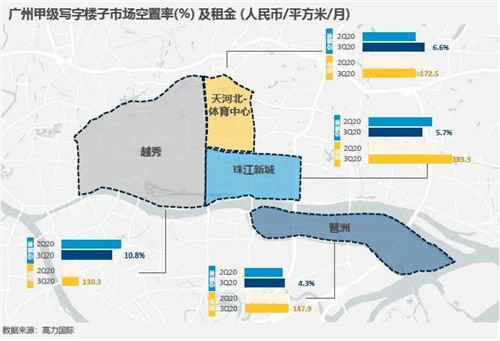 2020年第三季度,由于無新增供應入市,可租賃的面積較少,一些今年約滿、對物業要求較高的租戶多選擇遷入珠江新城。而其他對租金較為敏感的租戶則選擇了在天河或者海珠的產業園。