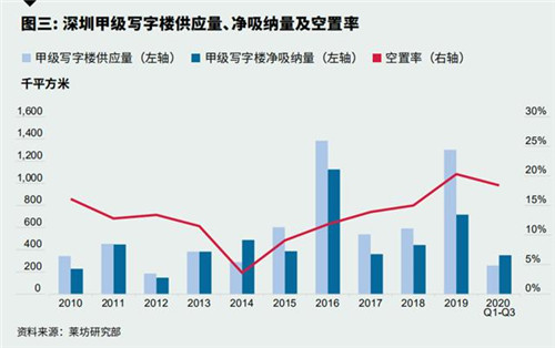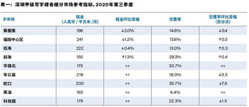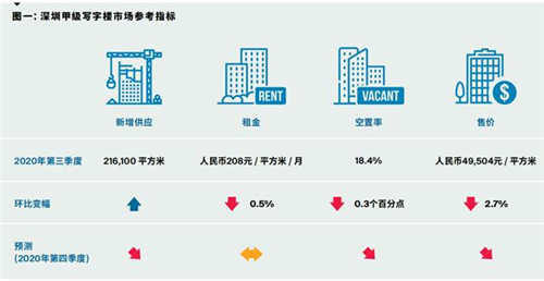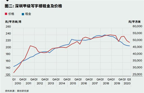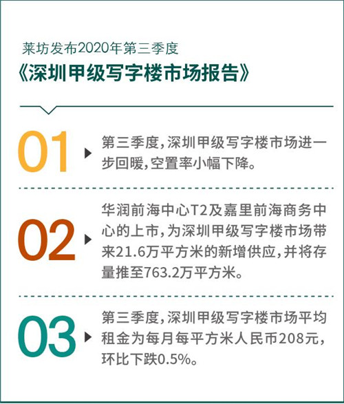 經濟的向好發展也帶動了深圳甲級寫字樓市場的進一步復蘇,寫字樓市場進一步去化。2020年第三季度,深圳甲級寫字樓市場的空置率環比小幅下跌0.3個百分點至18.4%,跌幅環比收窄0.5個百分點。受空置率依然高企的影響,深圳甲級寫字樓市場平均租金環比下跌0.5%至每月每平方米人民幣208元。租金的下跌趨勢也促進了優質企業,尤其是專業服務類及T M T類企業,積極尋求搬遷或擴張的機會。”