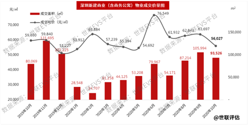 10月,深圳公寓市場新增融悅大廈、環球經貿廣場、會展灣水岸廣場、翠湖大廈等4個預售項目,新增供應面積16.85萬平方米。本月一手商業物業均價為56,027元/㎡,環比下跌12.0%。成交面積為93,526平方米,環比下跌11.8%,銷售仍保持暢旺,處于年內高位。