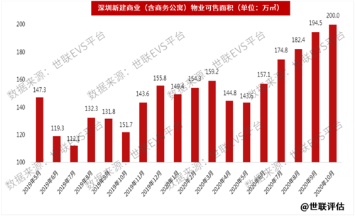 10月份,深圳新建商業物業(以商務公寓為主)可售面積為200.0萬平方米,環比上升2.8%,連續5個月上揚,再創近期新高。本指標顯示庫存壓力依然較大。