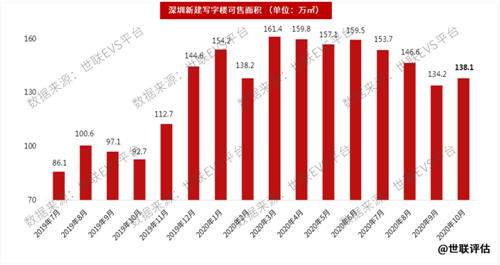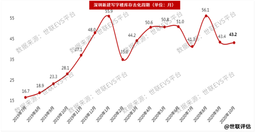 10月份,深圳新建寫字樓可售面積為138.1萬平方米,庫存量上升2.9%,總體呈趨勢性下降形態。新建寫字樓庫存去化周期為43.2個月,本指標顯示庫存壓力依然巨大。