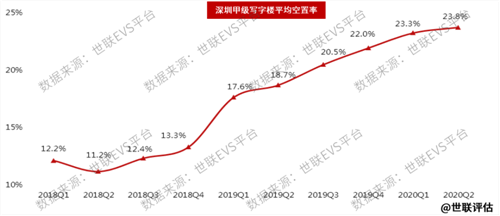 深圳商業性辦公用地供應過剩,近年寫字樓供應量足以滿足未來十年的需求,空置率及租金下跌幅度都位居四大一線城市之首。