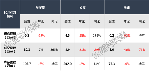 合富大數據顯示,10月廣州商業市場整體新增供應環比大幅減少,寫字樓及商鋪僅有零星新增供應,環比降幅均超9成,同比去年基本持平,公寓新增供應環比下降超8成,但同比去年大幅上升;成交方面,寫字樓由于大手交易支撐,10月成交有所上升,公寓及商鋪成交有所回落,公寓下降超2成,商鋪環比降幅近5成。庫存方面,整體庫存量基本持平并有減少的趨勢。