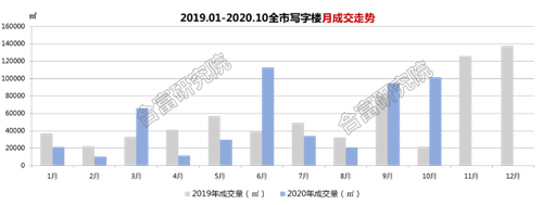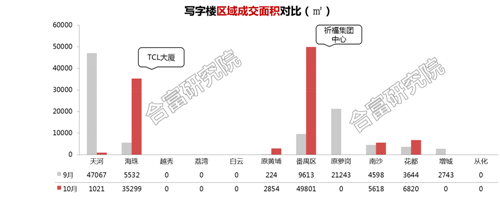 合富大數據顯示,10月全市寫字樓成交量為101413㎡,同比上升365%,環比9月份上升7%,由于大手交易較暢旺,9-10月市場保持強勢狀態。10月寫字樓新增供應僅3000㎡,環比9月下降超9成,主要來自海珠區琶洲板塊的國美智慧城部分樓層。