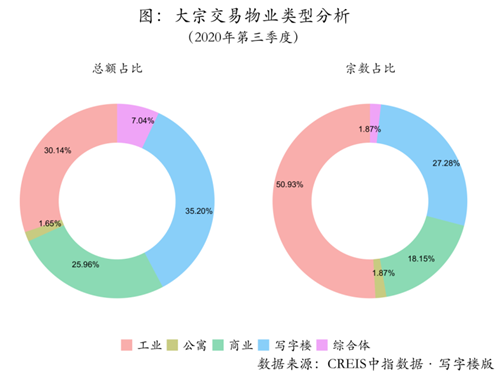 從大宗交易物業類型的交易總額來看,寫字樓占比超過三分之一,表明寫字樓依然最受機構投資者青睞,工業物業占比超三成,商業零售類物業成交約占26%,其余為綜合體和公寓,占比合計為9%左右。