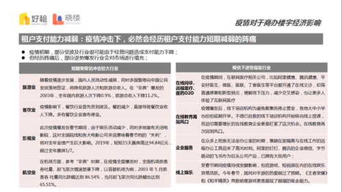 由于疫情對企業主體正常運轉的沖擊,租戶企業尤其是旅游、餐飲、影視等波及行業相關企業支付能力將下降。對此,已有寶龍集團、泰禾商業、世紀金源商管集團、融創文旅等超過85家房企、商企采取了租金減免的措施。此外,也有一些行業逆勢爆發,主要集中在在線問診、醫藥O2O、在線教育、在線辦公、線上娛樂這些領域。