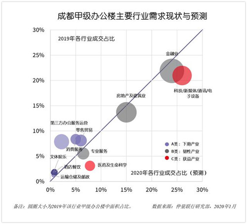 從產業屬性視角出發,以計件、計時工種為代表的勞動密集型制造業或面臨更高的生產與經營壓力,影響以短期為主;而科技、金融等高附加產業受影響更小。鑒于制造業在成都、重慶、西安三個辦公樓市場需求的占比并不高,預計市場短期下滑對辦公樓需求的直接影響有限。