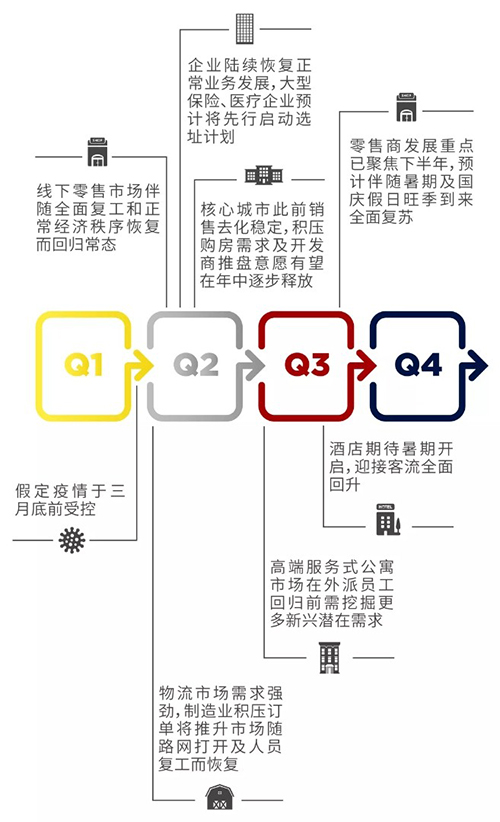 "住宅:伴隨預售證發放,以及積壓的購房需求陸續釋放,核心城市有望于年中開始逐步回暖;但高端租賃市場恢復需更多時日。