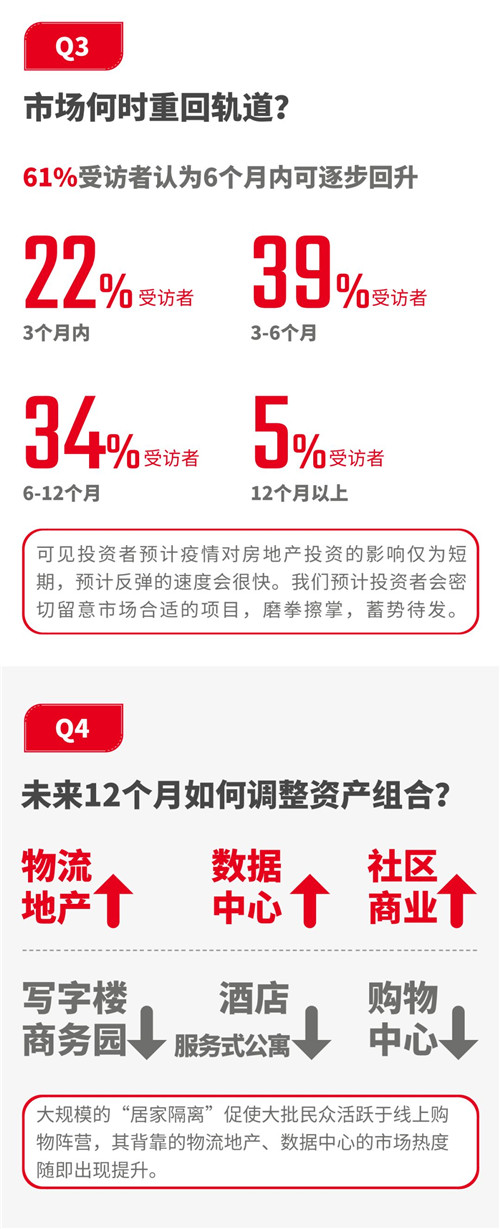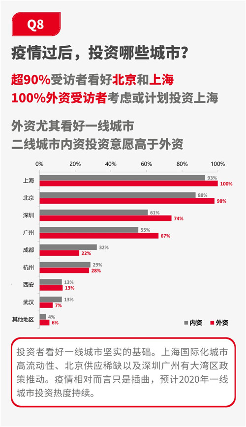 從調研結果來看,市場信心還是比較充足。超60%的受訪者認為投資活動將在疫情結束后6個月內得到反彈。并有99%的受訪者表示疫情過后依然會投資國內。城市方面,投資者對一線城市熱情更為高昂,其中尤以外資為甚,100%外資受訪者均表示未來12個月內有投資上海的計劃。