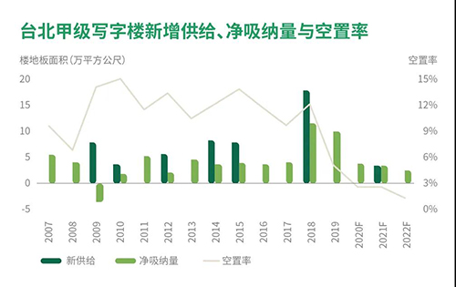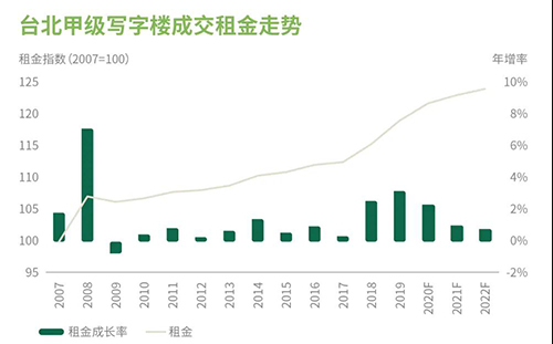 甲級寫字樓平均租金維持上揚走勢:由于臺北市中心甲級寫字樓空置率全面下降,CBRE預期2020年租賃市場仍然是“房東市場”?剂课磥砣陜扰_北新增供給量體有限,甲級寫字樓房東將保持強勢的態度,目前已經創新高的開價水準將維持不變。位于信義基隆區的甲級寫字樓房東可能提出超過10%的租金調幅。