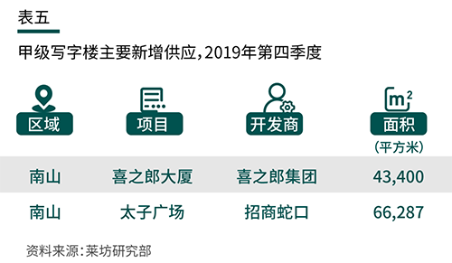 第四季度,深圳甲級寫字樓市場有兩個(gè)新項(xiàng)目竣工交付,為市場帶來約109,687平方米的辦公面積,甲級寫字樓市場存量升至737萬平方米。市場新增供應(yīng)均位于南山區(qū)。