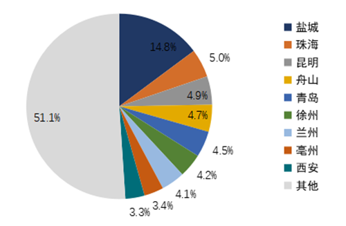 2019年,百?gòu)?qiáng)代表企業(yè)新增商辦用地較多的城市主要有鹽城、珠海、昆明、舟山等二線及三四線城市,其中長(zhǎng)三角及珠三角區(qū)域仍是布局熱點(diǎn)。