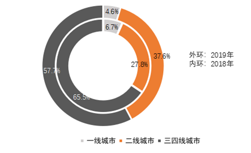 2019年,商業(yè)地產(chǎn)百?gòu)?qiáng)代表企業(yè)平均新增商辦用地規(guī)劃建筑面積為78.8萬平方米,同比上升18%,投資有所增長(zhǎng)。2019年城市布局中,百?gòu)?qiáng)代表企業(yè)在一線城市的土儲(chǔ)規(guī)模占比縮減至4.6%;二線城市新增商辦用地占比增長(zhǎng)至37.6%,較上年提高9.8個(gè)百分點(diǎn);三四線城市占比為57.7%,但占比較上年有所回落。