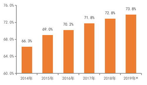 2019年商業(yè)地產(chǎn)百?gòu)?qiáng)代表企業(yè)的資產(chǎn)負(fù)債率均值上升至73.8%,較2018年提高1.0個(gè)百分點(diǎn)。盡管自2014年至今,商業(yè)地產(chǎn)百?gòu)?qiáng)代表企業(yè)的資產(chǎn)負(fù)債率呈持續(xù)上升態(tài)勢(shì),但商業(yè)地產(chǎn)企業(yè)的資產(chǎn)負(fù)債率尚在可控范圍內(nèi)。代表企業(yè)以較穩(wěn)定的租金收入作為經(jīng)營(yíng)保障,整體仍保持穩(wěn)健運(yùn)行。