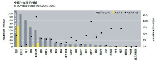 圖表:全球生命科學領域前25個國家的融資總額,2015-2019