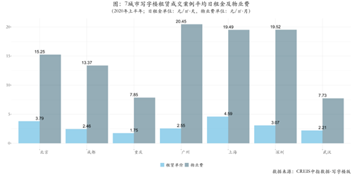 6月,北京甲乙級寫字樓日租金位列20城最高,達7.19元/㎡·天,合肥最低,為1.76元/㎡·天,廈門、福州同比微漲。
