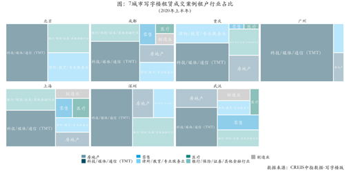 租戶行業:上半年,北京TMT租戶占比最高,達50%,其次為專業服務業和金融業,分別為25%;上海TMT和金融占比分比為37.3%和22%;成都TMT占比達40.59%,為最高,其次為金融業和專業服務業,占比均為15%左右;重慶TMT占比為42.62%,其次為專業服務業和金融業,分別為21.3%和16.4%;廣州TMT占比高達87.5%;深圳TMT占比為50%,其次為金融業,占比為25%;武漢TMT占比超三成,其次為房地產、金融業和零售,分別為16%、14.5%和12.9%。