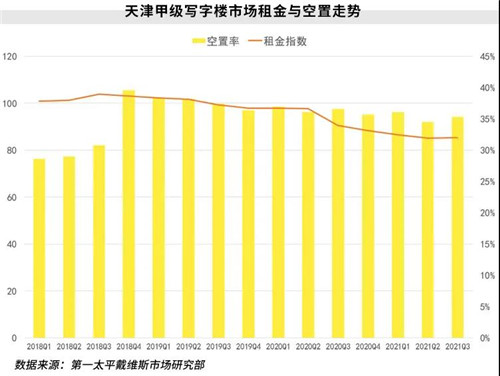 三季度,天津寫字樓市場空置率同比下降1.3個百分點至35.3%,環比略有上漲,為0.8個百分點。平均租金穩中有升,租金指數環比上升0.4%,同比下降5.7%。針對教育培訓行業的“雙減政策”雖暫時性引發了天津寫字樓市場租賃活動的波動,但未對市場整體走勢造成重大沖擊和影響。天津寫字樓各樓宇承載著來自不同行業的企業租賃需求,細分行業的短期調整與波動難以撼動整體市場,業主方可根據市場變化來進行租戶結構的更新換代。