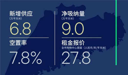 位于天河區東部的美林天地二期于本季正式開業,物業總建筑面積為12萬平方米,開業率超過九成。其中的主力租戶山姆會員店,為時隔13年后在廣州設立的第二家門店。除此之外,部分老項目開展租戶調整,效果良好,迎來新品牌陸續進駐,帶動市場吸納量環比顯著增加。空置率環比下降0.4個百分點,連續第四個季度下調至本季末的7.8%。