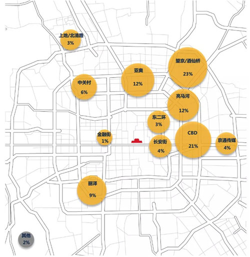 就成交商圈而言,由于互聯網頭部企業在望京/酒仙橋商圈的迅猛擴張,望京/酒仙橋商圈成交總量居各商圈之首,成交面積占比達23%。在頭部科技企業、大型金融機構及地產公司的擴張布局下,越加受到租戶青睞的亞奧與麗澤商圈于本季度出現大面積成交,其在全市總成交面積中分別占比12%和9%,分居第三、第四位,僅低于望京/酒仙橋商圈與中央商務區。