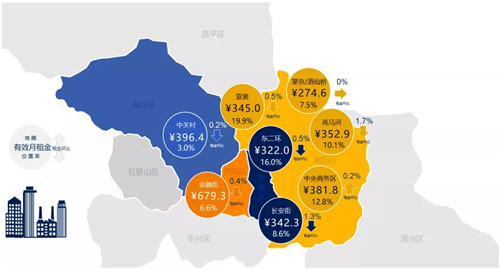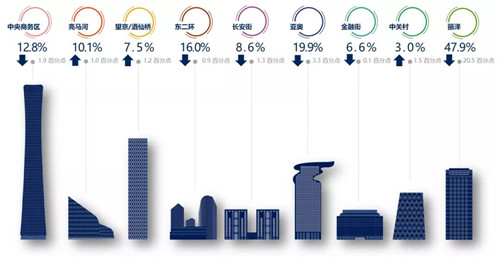 在空置率方面,世樺嘉潤副總裁徐榮卿先生認為,得益于經濟企穩回暖,租戶市場需求也在進一步得到釋放。受此影響,本季度北京甲級寫字樓市場的空置率繼續環比下降3.0個百分點,跌至16.2%。乙級寫字樓市場由于行業調整和租戶的搬遷升級,空置率環比提高了1.3個百分點至13.1%。就北京甲級寫字樓市場各商圈而言,因科技和金融企業在麗澤商圈的擴張布局及本季度一些大面積成交的達成,麗澤商圈甲級寫字樓市場空置率大幅下降20.5個百分點至47.9%,成為甲級寫字樓市場空置率降幅最大的商圈。租金的持續下調同樣帶動了亞奧商圈的活躍市場表現,其寫字樓市場空置率也降低3.3個百分點至19.9%。相對而言,由于受到一些租戶為節約成本,而選擇縮小租賃面積或退租的影響,中關村、望京/酒仙橋與亮馬河商圈的寫字樓市場空置率分別環比上浮1.5、1.2及1.0個百分點。