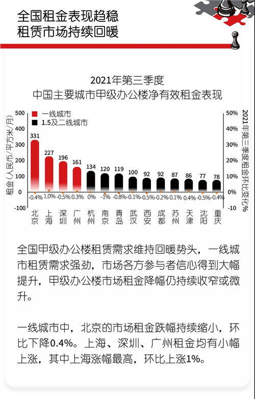 近日,仲量聯行發布2021年第三季度全國辦公樓市場概覽指出,三季度,全國寫字樓整體市場需求復蘇加速,全國租金表現趨穩,“雙減”政策對一線城市甲級辦公樓影響有限。