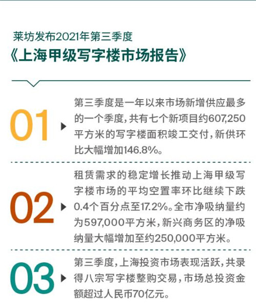 我們預計2021年第四季度市場還將有50萬平方米的寫字樓新項目入市,新項目主要集中在浦東前灘、世博以及徐匯濱江區域。隨著浦東“引領區”建設方案的落地和推進,浦東吸引外資的磁石作用將更為明顯,企業入駐以及更多資本的投入將助力浦東區域內寫字樓的面積去化和租金提升。整體市場上,租賃需求的穩定釋放,預計將帶動市場空置的進一步降低,市場租金有望繼續增長。