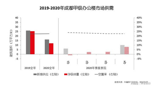 三、供應方面,2020年成都甲級辦公樓新增供應約16.1萬平方米。新入市項目為金融城板塊的天府國際金融中心以及市中心板塊的豐德成達中心。受疫情影響,業主方或因工程進度延后、資本壓力或需求預期下行等因素調整項目入市時間。與2019年預測數值相比,延期率高達36%。但較低的新增供應也使得在需求收緊的背景下,市場空置壓力所有減輕。在供需均較年初預期有所收窄的情勢下,2020年成都甲級辦公樓空置率并未出現明顯上升,僅同比小幅上升0.1個百分點,至年末報22.5%。