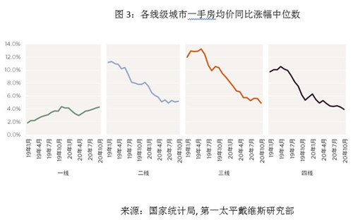 住宅市場在經歷2020年初新冠疫情影響后率先走出V型反彈,在第二季度末已基本恢復疫情前的銷售水平,在下半年更是達成了成交量新高。在下半年政策趨于收緊的前提下,來自遞延購房及置換需求的購房者仍舊為市場帶來了穩固支撐。然而各城市的住宅市場存在分化。一線城市在疫情沖擊過后房價漲幅維持穩步上升,而其余線級城市在2019年開始漲幅已呈現波動收窄。