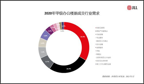 伴隨著中國產(chǎn)業(yè)結(jié)構(gòu)調(diào)整,人工智能、5G技術(shù)、生物醫(yī)藥等高附加值的戰(zhàn)略新興產(chǎn)業(yè)進入快速成長期,中資龍頭企業(yè)產(chǎn)業(yè)內(nèi)生性將發(fā)揮作用。2020年西安甲級辦公樓租賃成交面積超500平方米的占比上升至27.0%,同比增長4個百分點。在1,000平方米以上的新租企業(yè)中,全國性的中資企業(yè)占比高達88.4%,成為疫后辦公樓市場需求恢復(fù)的主要支撐點。新興產(chǎn)業(yè)的前期規(guī)劃以政策加碼的產(chǎn)業(yè)園區(qū)為主導(dǎo),但隨著產(chǎn)業(yè)布局的深入,其前臺屬性的銷售部門、后臺客服中心、相關(guān)上下游企業(yè)將會向商務(wù)區(qū)的優(yōu)質(zhì)辦公樓轉(zhuǎn)移,從產(chǎn)業(yè)辦公到商業(yè)辦公需求的升級迭代或?qū)硇碌男枨簏c。在2020年西安甲級辦公樓新成交的租賃面積中,以科技互聯(lián)網(wǎng)為代表的戰(zhàn)略新興產(chǎn)業(yè)需求占比高達33.4%,成為西安甲級辦公樓租賃市場的主要來源。