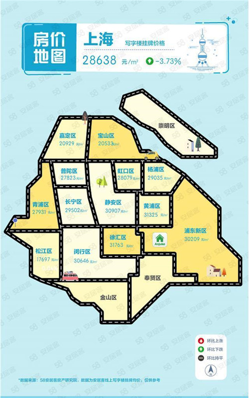 58同城、安居客《2020年Q4寫字樓價格地圖》顯示,四季度上海寫字樓掛牌價格為28638元/㎡,環比下跌3.73%。分區域來看,徐匯區以31763元/㎡的掛牌價格排在各區首位,黃浦區、閔行區、靜安區和浦東新區寫字樓掛牌價格也都維持在3萬/㎡以上水平。長寧區、普陀區、青浦區、虹口區、楊浦區、寶山區和嘉定區寫字樓掛牌價格均處于2萬/㎡以上水平。松江區寫字樓掛牌價格為17697元/㎡,處于相對較低區域。