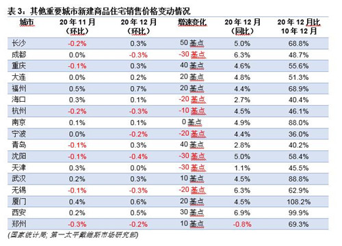 至年末住宅市場走勢趨于平淡, 12月各城價格漲跌幅度均未超過1%。一、二線城市基本錄得4-6%的同比增長,僅鄭州除外,價格低于上年同期水平。價格指數(shù)自2010年12月設(shè)立至今已滿10年,在此期間一線城市新建商品住宅價格實現(xiàn)翻番,二、三線城市平均漲幅分別在65%、53%。南區(qū)城市深圳(136%)、廈門(108%)、廣州(106%)的新建商品住宅價格均增長一倍有余。