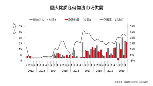 2020年,重慶倉儲市場共有15個項目交付使用,新增倉儲面積合計達116.8萬平方米,創年度新增最高紀錄。其中空港、九龍坡-江津、西部物流園三個子市場均錄得大量新項目入市;此外,北碚蔡家地區迎來首個高標庫項目,成為重慶兩江新區物流版圖的又一重要補充。