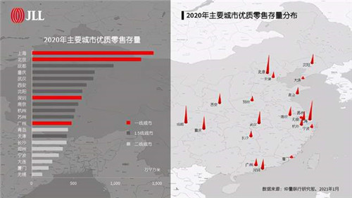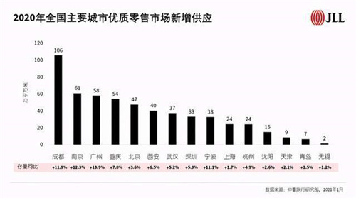 仲量聯行數據顯示,2020年中國大陸20個主要一二線城市優質零售物業市場新增供應接近600萬平方米,同比回落1/4左右,總存量增長至1.16億平方米。全年,成都以106萬平方米的新增供應引領全國,南京、廣州、重慶三個城市增量超過50萬平方米,分列二至四位。