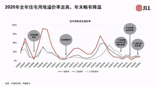 土地市場方面在融資環境收緊以及多地政策趨嚴的背景之下,房企拿地將趨于理性,土地市場面臨降溫,2021年土地溢價率可能有所回落。