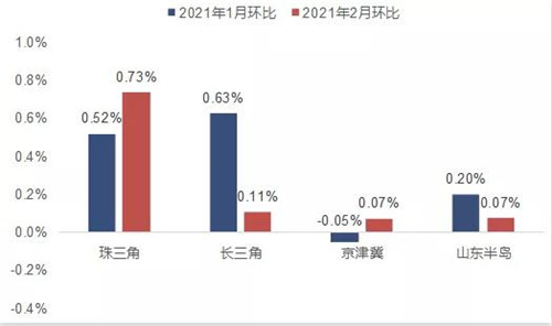2021年2月中國百城新建住宅價格及環(huán)比漲跌幅