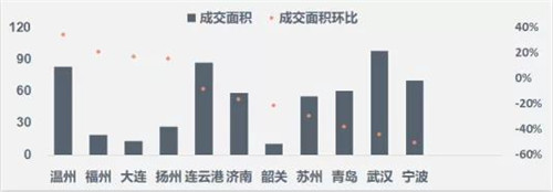 圖:二三線重點(diǎn)城市成交面積環(huán)比漲跌幅