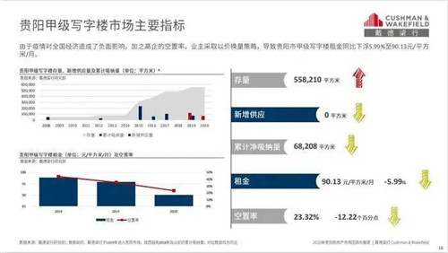 從2019年下半年開始,受經(jīng)濟(jì)大環(huán)境影響,業(yè)主開始主動降價以刺激市場需求;2020年上半年,疊加疫情影響,貴陽新增需求減少,部分樓宇空置率明顯上升,業(yè)主繼續(xù)采取以價換量策略,使得2020年貴陽市甲級寫字樓租金同比下降5.99%至90.13元/平方米/月。2020年下半年疫情逐步得到控制,市場復(fù)蘇加快,最終錄得空置率同比下降12.22個百分點(diǎn)至23.32%,全年累計凈吸納量達(dá)68,208 平方米。