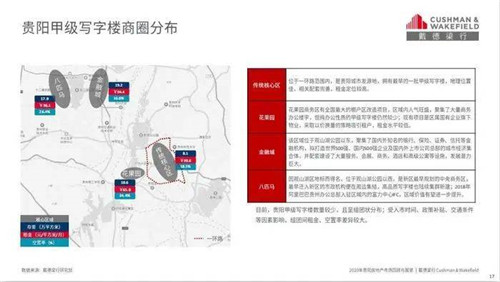 目前,貴陽甲級寫字樓數(shù)量較少,且呈組團(tuán)狀分布;受入市時間、政策補(bǔ)貼、交通條件等因素影響,組團(tuán)間租金、空置率差異較大。