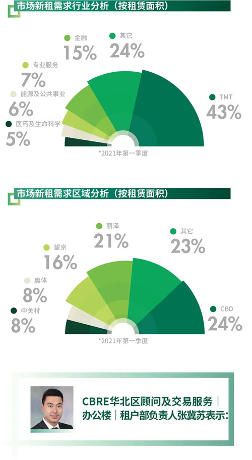2021年第一季度,位于奧體、石景山和西直門區域的三個新項目交付使用,為寫字樓市場帶來共計15.3萬平方米的租賃面積。