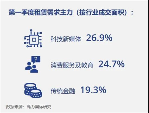 科技新媒體、消費服務及教育、傳統金融構成了當季前三大需求主力,其新增租賃面積占比分別為26.9%、24.7%、19.3%。從區域來看,季內市中心區域持續吸納大面積租戶,錄得多宗來自在線教育、能源及互聯網等行業的租賃成交。與此同時,金融城子市場大面積租賃需求活躍。