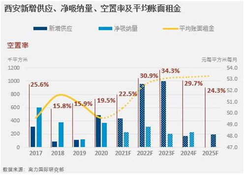 受部分項目開發交付節點影響,高力國際認為2021年仍是西安甲級寫字樓“去庫存”的一年,伴隨著市場需求的持續回暖,預計未來一年市場平均空置率將有較大幅度的下降。而自2022年起,市場將逐漸進入供應放量的通道,雖市場需求仍將保持相對穩定,但大量優質項目的入市將加速老舊項目以價換量的情況,致使租金仍將處于下行通道,降幅也將隨著供應的放量而放寬。