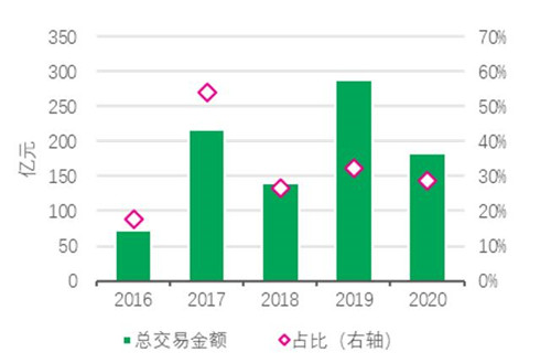 圖:近五年城市更新類(lèi)交易額及占總體比