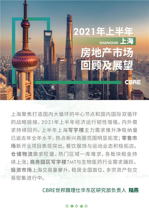 CBRE華東區投資及資本市場部負責人王晶表示:“極具韌性的經濟表現、政府的刺激政策和疫苗接種率的提高,上海正以‘中國速度’極大地提振國內外投資者的信心,下半年投資市場活躍度有望進一步提升,資本市場步入更加理性的價值投資新階段。在新經濟和消費升級的推動下,產業園區、物流倉儲與長租公寓將進一步成為投資者加快投資組合多樣化的關注點,而核心區域內具有改造、轉型潛力的老舊項目亦將受到長期關注,存量重塑,城市更新將在盤活低效空間,激發商業活力,推動產業升級中發揮重要的作用。”